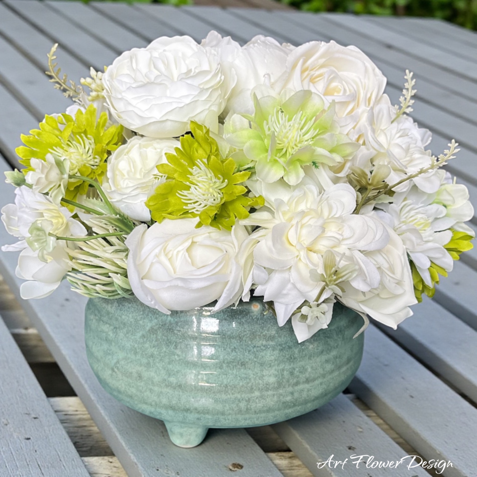 Ez a letisztult, mégis gazdagon rétegzett selyemvirág asztaldísz a tavaszi frissesség és az időtálló elegancia találkozása. A krémfehér rózsák, légies szirmú virágok és finom zöld növények harmonikus kompozícióját egy különleges, lágy árnyalatú zöld kerámia tál fogja össze.