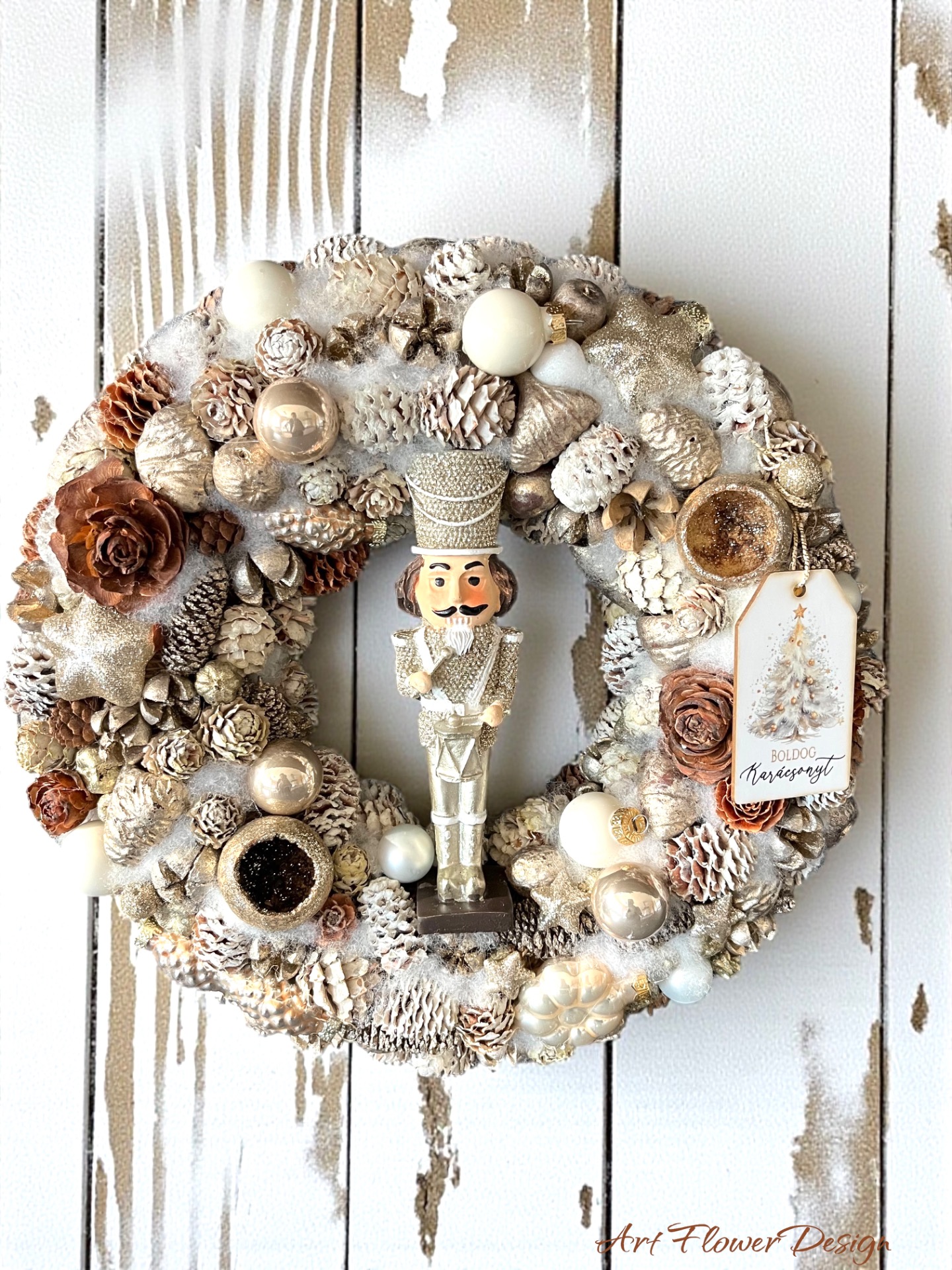 Elegáns, ünnepi hangulatú ajtódísz arany–krém színekben, középen klasszikus diótörő figurával. Termésekkel, fényes díszgömbökkel és finom csillogással díszítve – tökéletes választás a karácsonyi időszakra.
