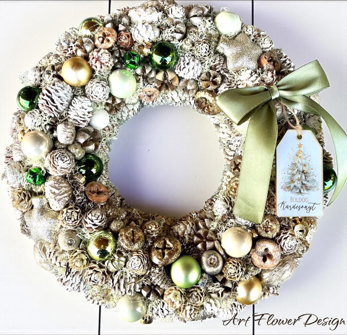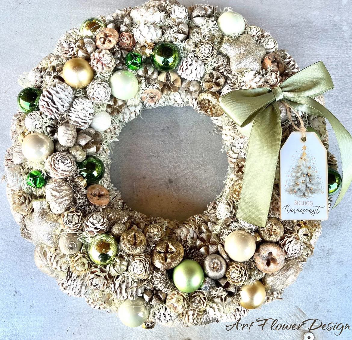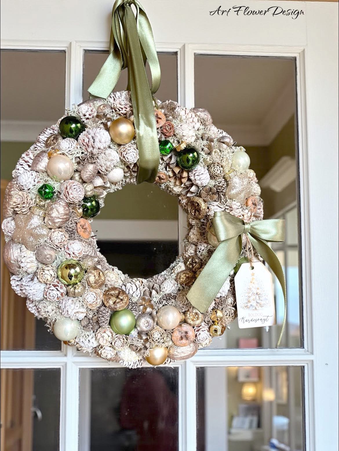 Csillogó, ünnepi hangulatú kopogtató arany, piros és zöld díszekkel, finom masnival. Klasszikus és modern otthonokhoz is tökéletes választás. Kézzel készült, egyedi darab az Art Flower Design műhelyéből.