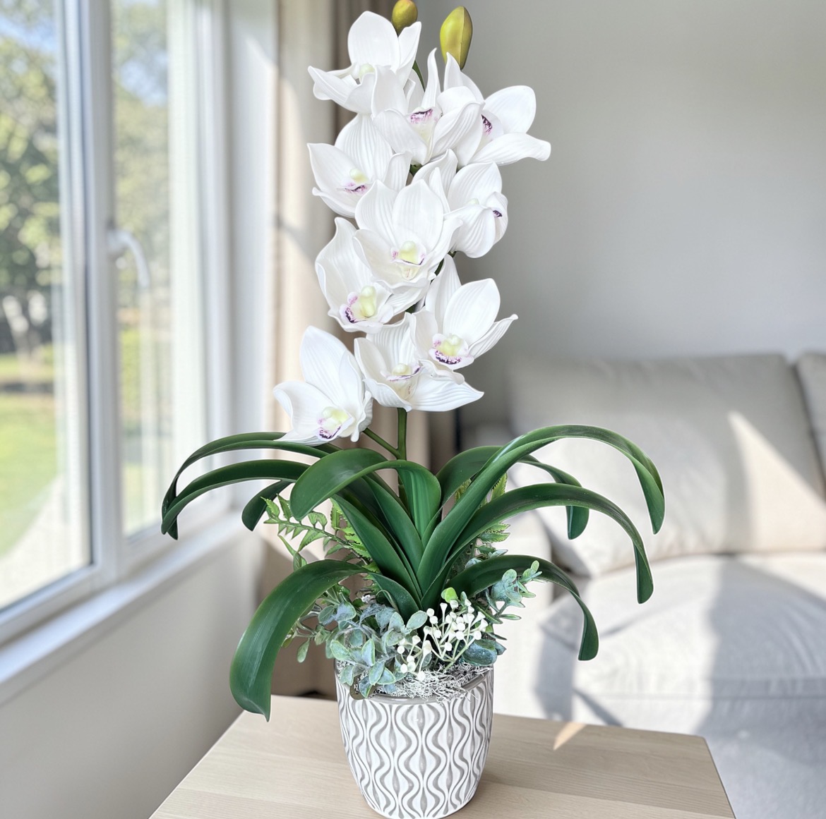 Gyönyörű, élethű Cymbidium orchidea letisztult kaspóban, amely elegáns és természetes megjelenésével bármely enteriőr különleges dísze lehet. A részletgazdag kidolgozásnak köszönhetően az orchidea virágai és levelei élethű hatást keltenek, így hosszú távon is megőrzi szépségét gondozás nélkül.