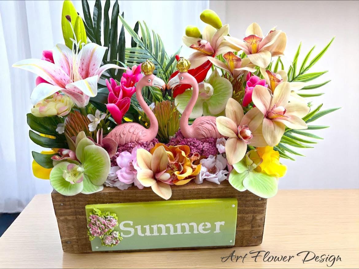 Trópusi virágok,flamingók,vibrló színek egy különleges kézműves fa ládikában