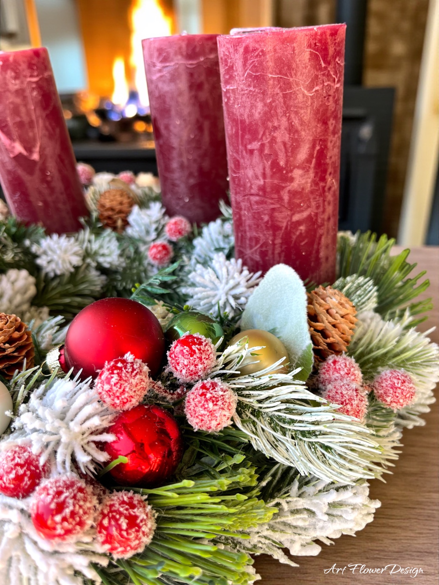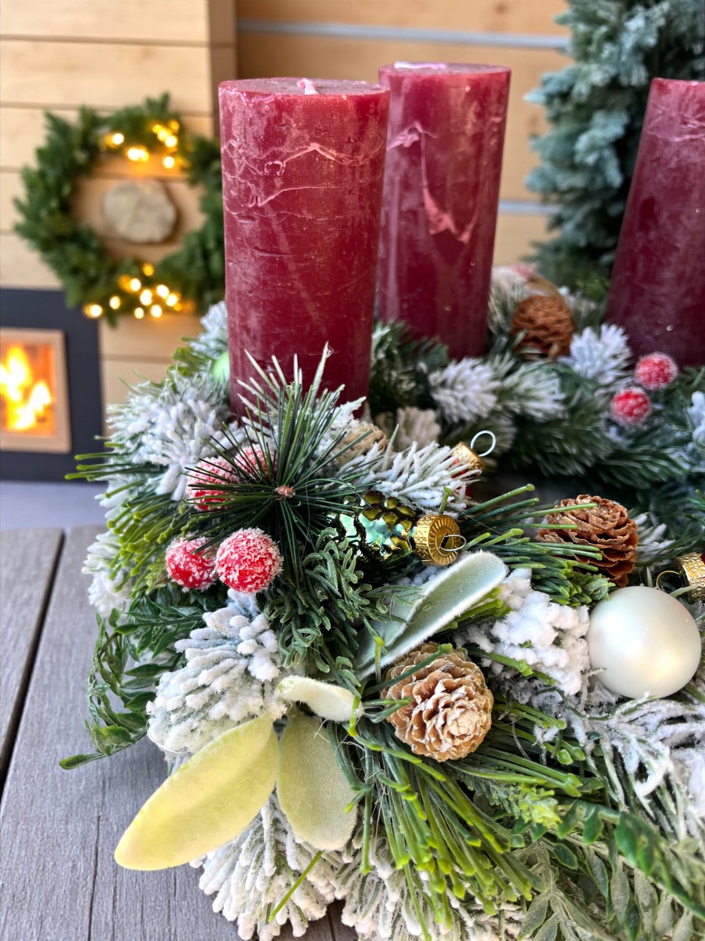 Ez a klasszikus, mégis elegáns adventi koszorú meghitt ünnepi hangulatot varázsol otthonodba. A dús, havazott fenyőágak között apró tobozok, bogyók és fényes díszgömbök kaptak helyet, melyeket négy mélybordó gyertya koronáz meg.