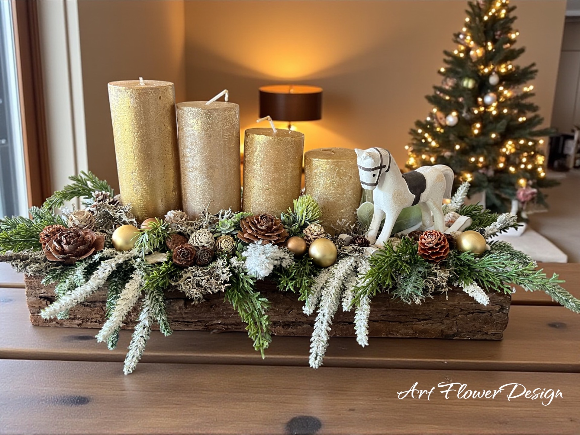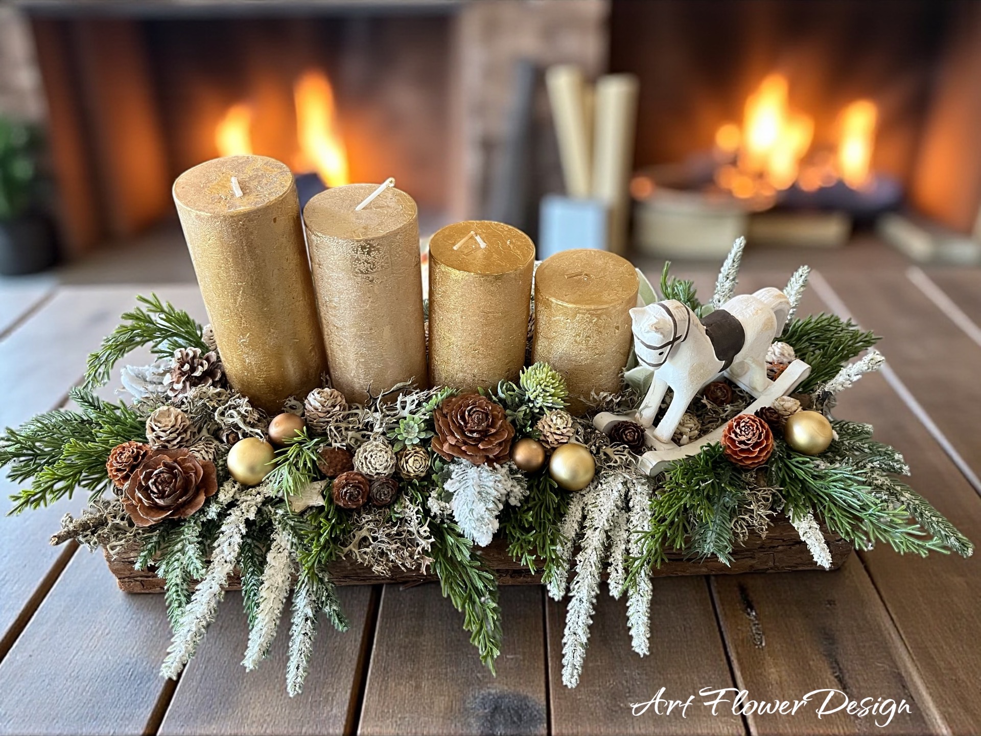 Meghitt, ünnepi hangulatú asztaldísz természetes alapokon, arany gyertyákkal, tobozokkal és bájos hintalóval – a karácsony varázslatos hangulatához.