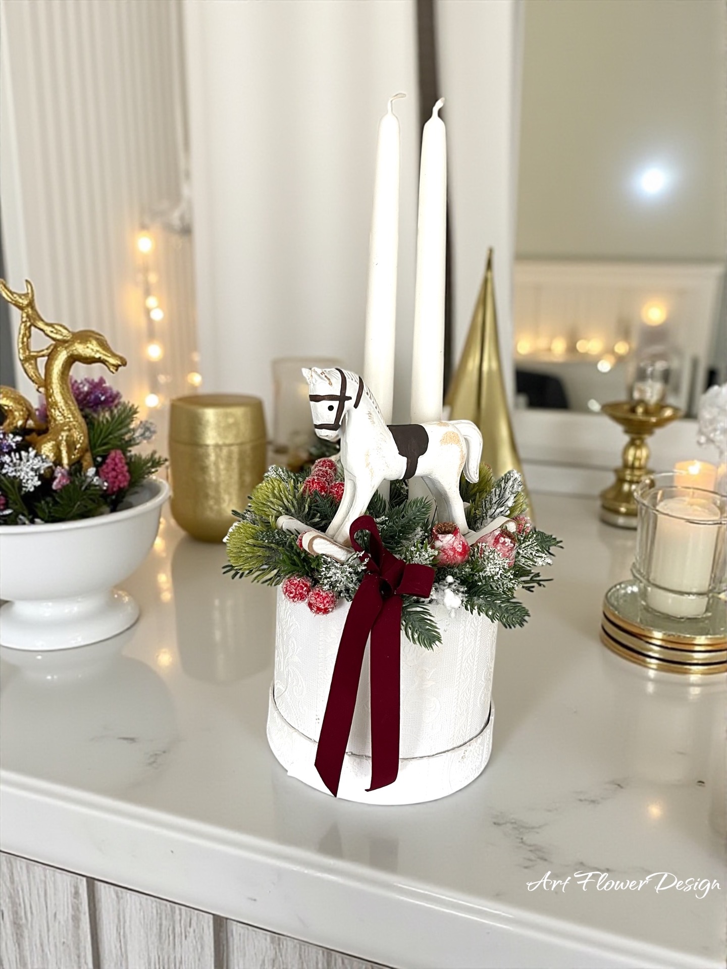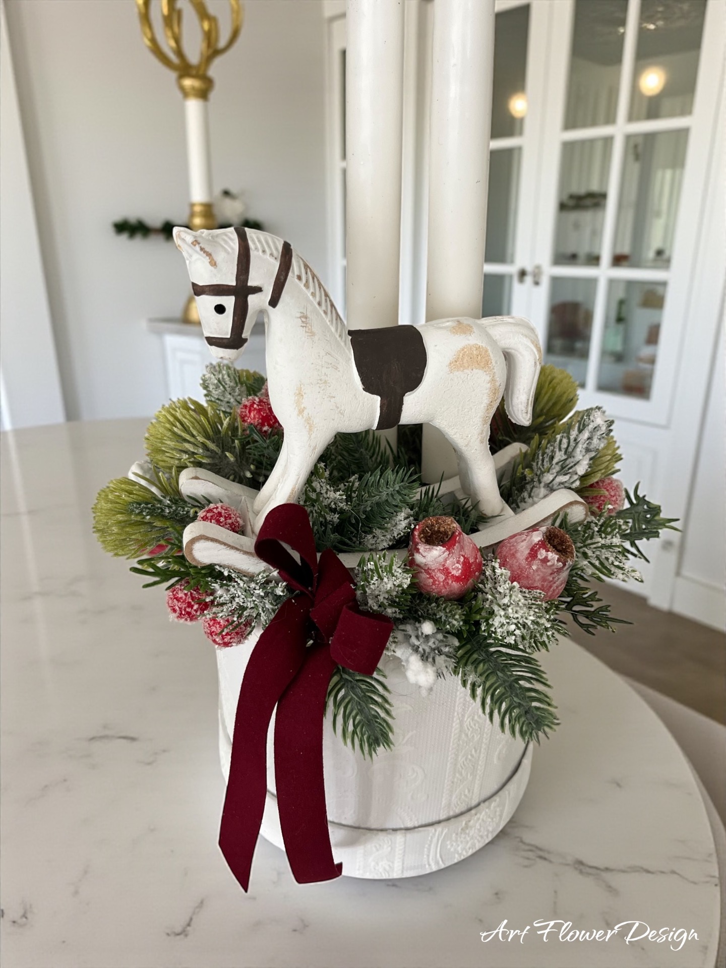 Egy különleges, nosztalgikus hangulatú karácsonyi asztaldísz, amely a gyermekkori emlékeket idézi meg. A fehér–bordó színvilág elegáns és meghitt összhatást teremt, a középen elhelyezett fa hintaló pedig bájos, játékos részletként vonzza a tekintetet.