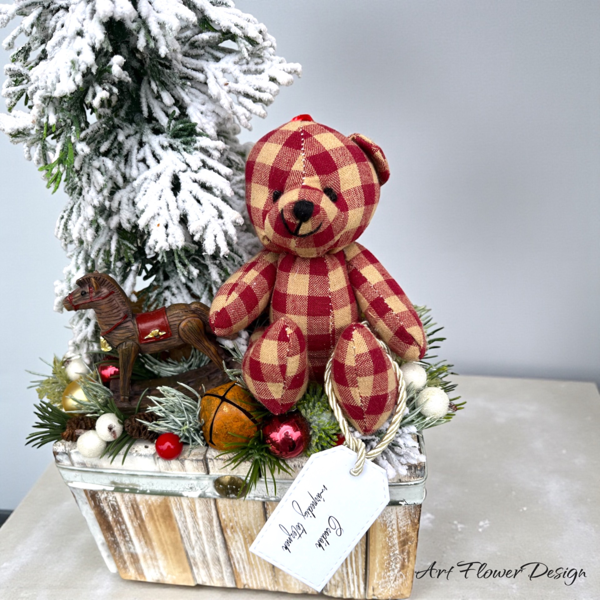 Különleges, hangulatos karácsonyi dekoráció kézzel készítve. A hóval borított mini fenyőfa, a klasszikus kockás textil mackó és a fa hintaló együtt egy meghitt, nosztalgikus ünnepi világot idéznek. A természetes alapanyagokból összeállított dísz apró gömbökkel, bogyókkal és zöldekkel kiegészítve válik teljessé.