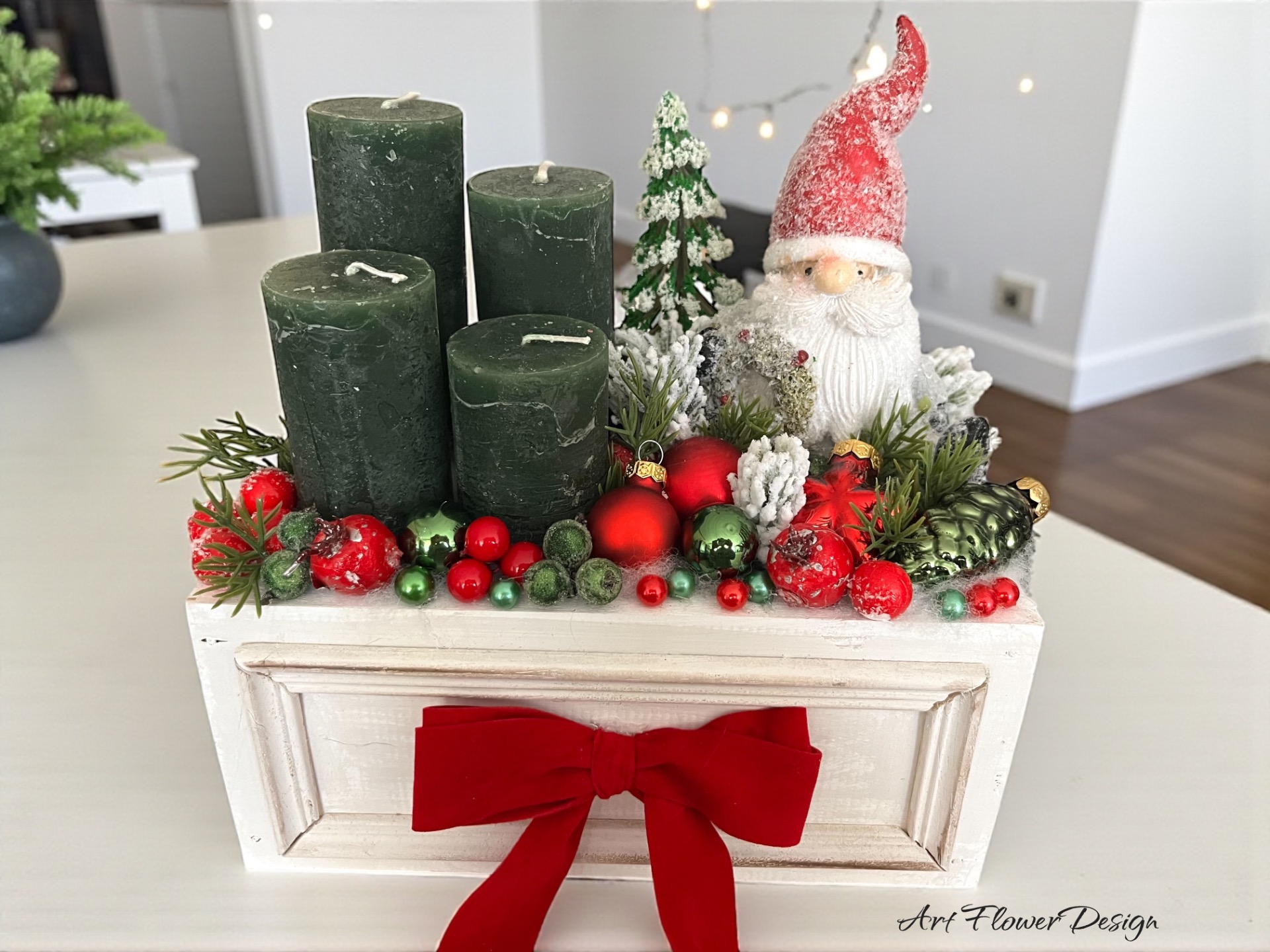 Meghitt, klasszikus hangulatú karácsonyi asztaldísz, amely az ünnepi időszak igazi éke lehet. A natúr, antikolt hatású faalapra készült kompozícióban négy mélyzöld gyertya, havas hatású fenyőágak, bogyók, tobozok és csillogó díszgömbök kaptak helyet. A dísz különlegességét a kedves Télapó figura és a piros bársonymasni adja, amely tökéletesen kiegészíti a tradicionális zöld–piros színvilágot.
