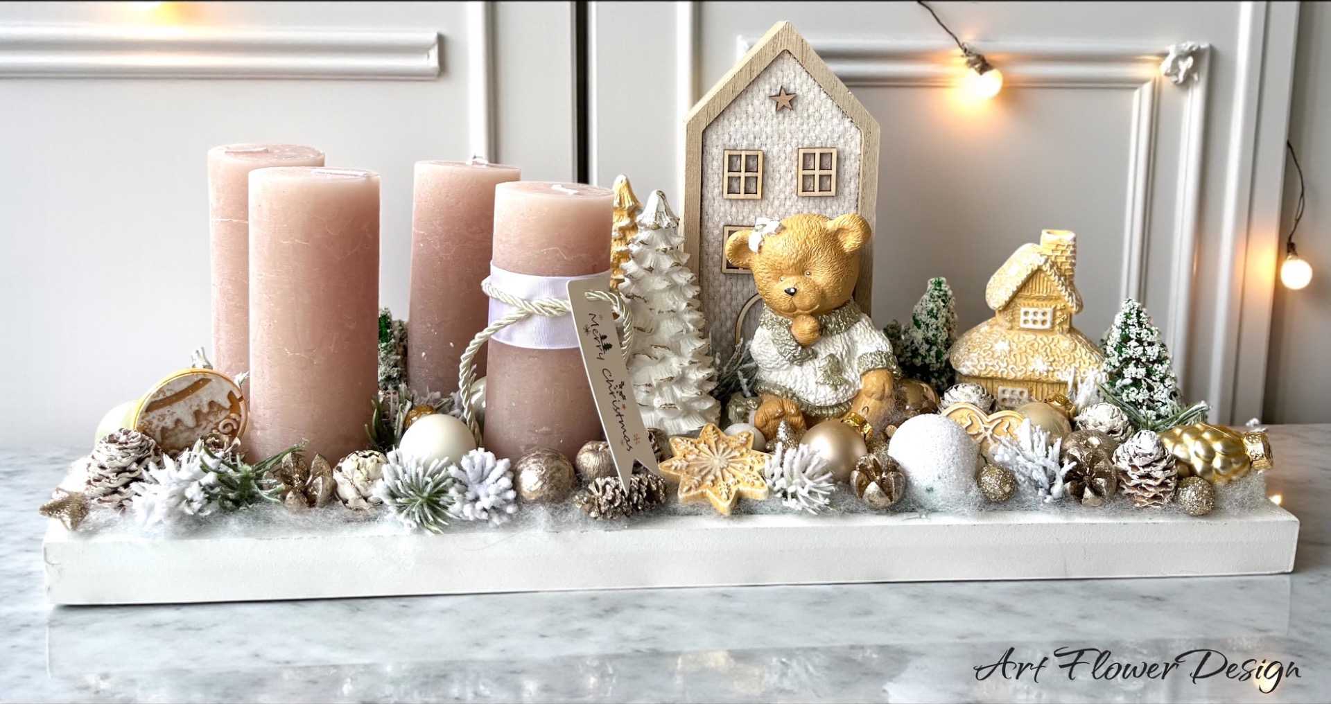 A négy natúr gyertya lágy fénye aranyban csillanó díszekkel, havas apró részletekkel és kézzel készült kerámia házikóval, macival és fenyőfával alkot harmonikus egységet.