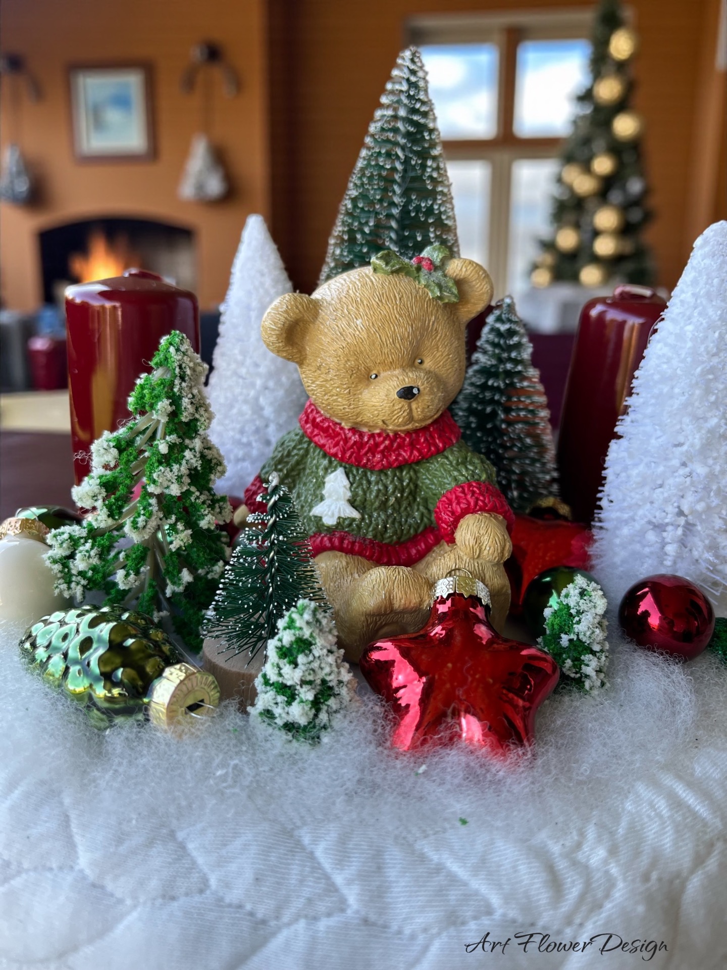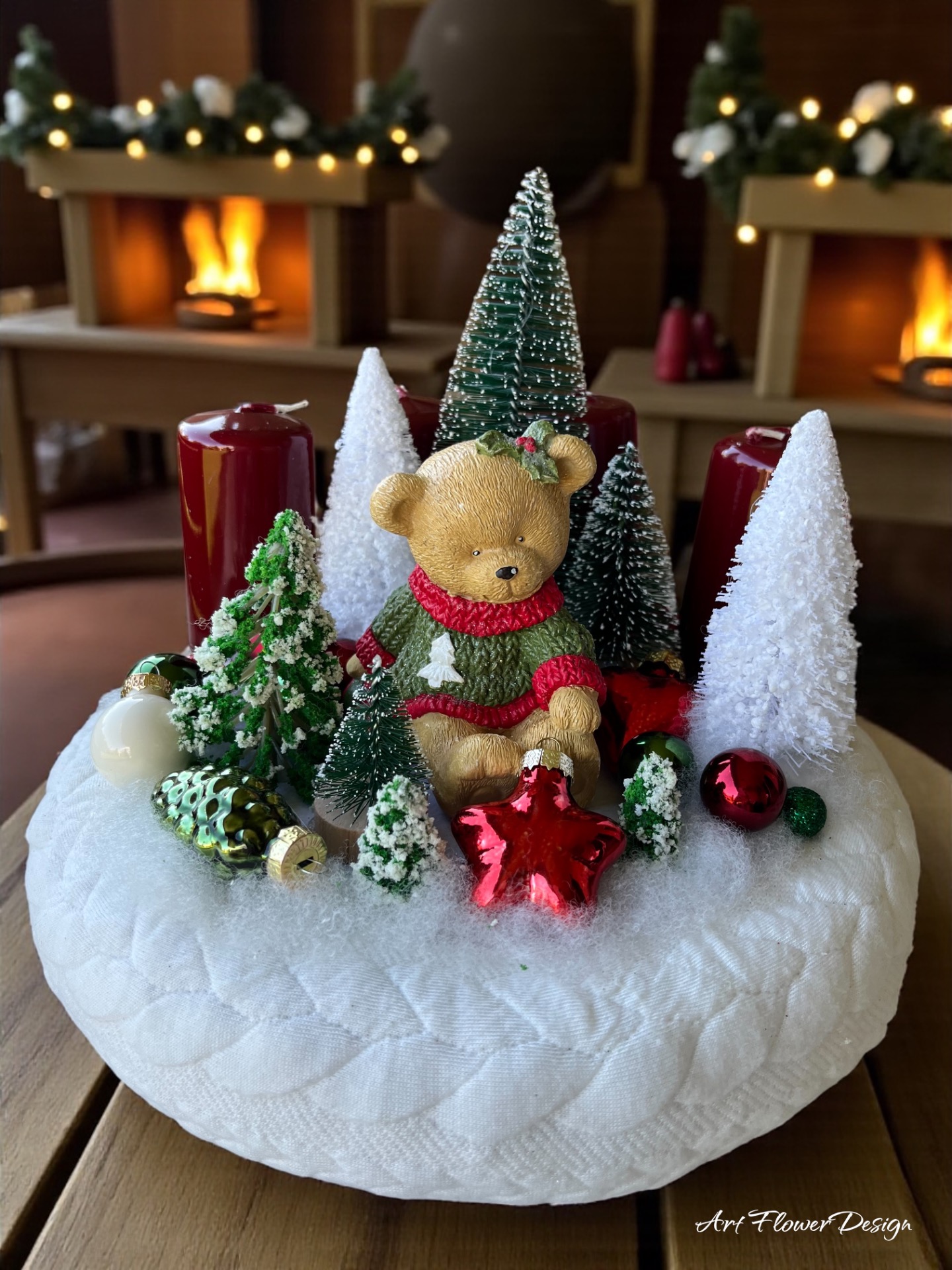 Anyagok: textil alap, selyemzöld fenyők, műhó, gyertyák, kerámiafigura, karácsonyi díszek