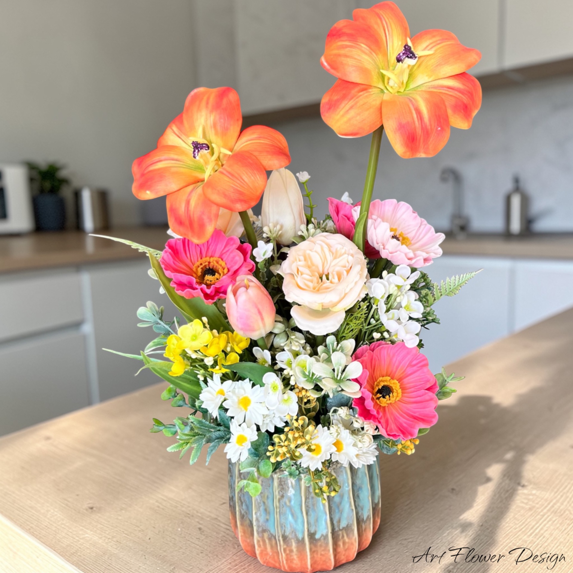 Időtálló selyemvirágokból készült, kerámia kaspóban.