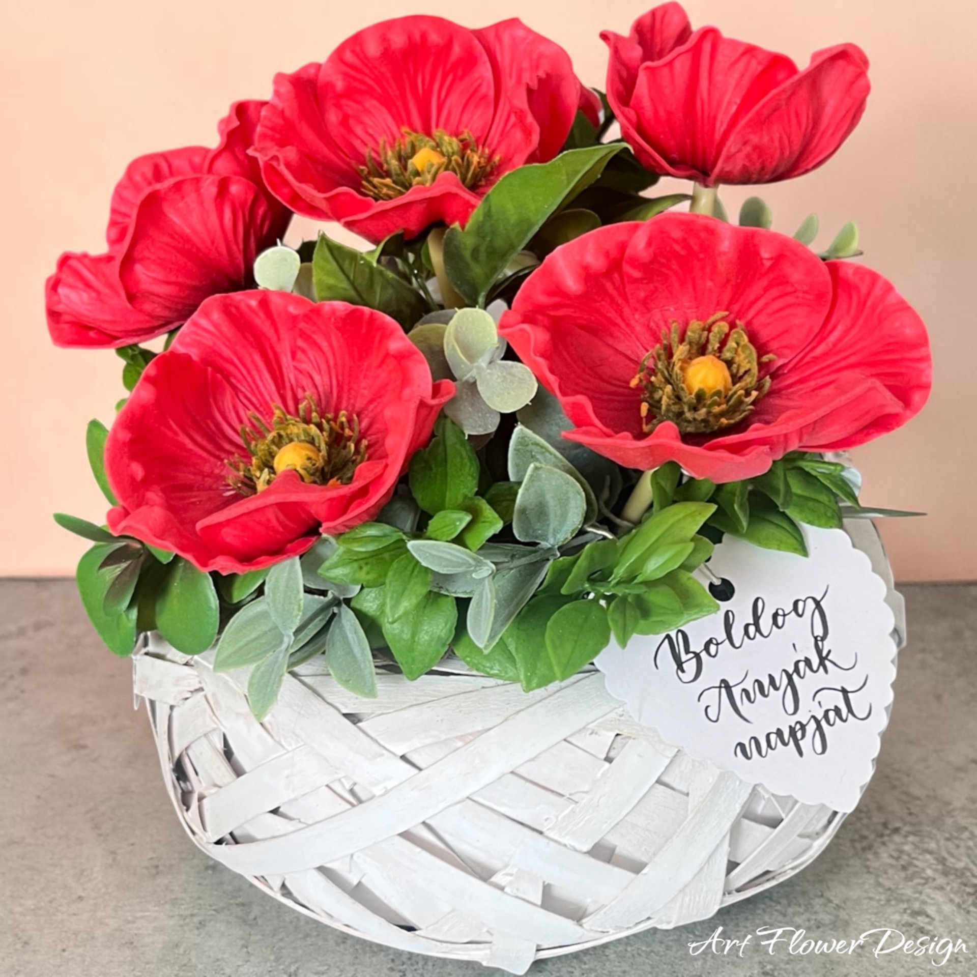 Ez világos tónusú fonott kaspóba készült virágkompozíció a természetesség és a gyengéd elegancia harmonikus találkozása. Az élénkpiros pipacsok lágyan emelkednek ki a zöld levelek közül, légies, romantikus összhatást teremtve.