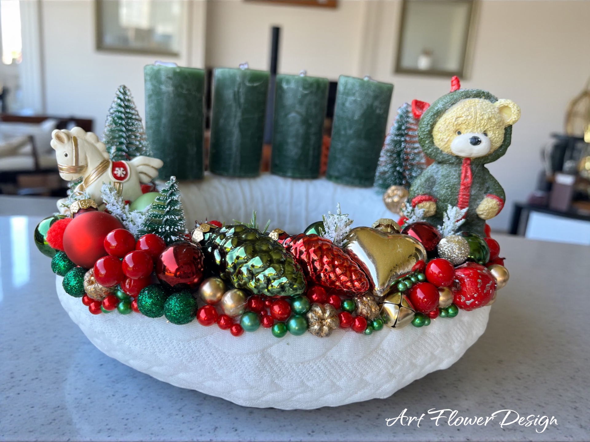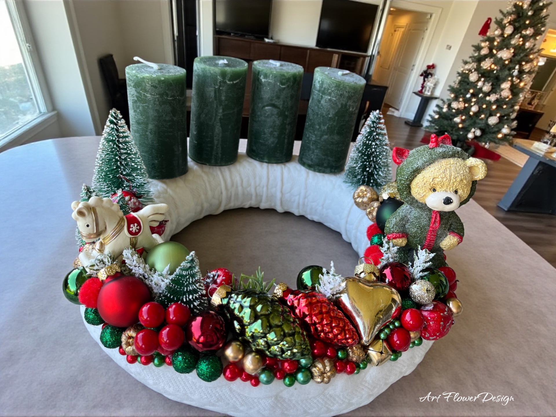 A piros, zöld és arany színek harmóniája, a kis mackó és hintaló díszei a régi idők melegségét hozzák vissza – mintha egy nagymama kis karácsonyfája elevenedne meg.