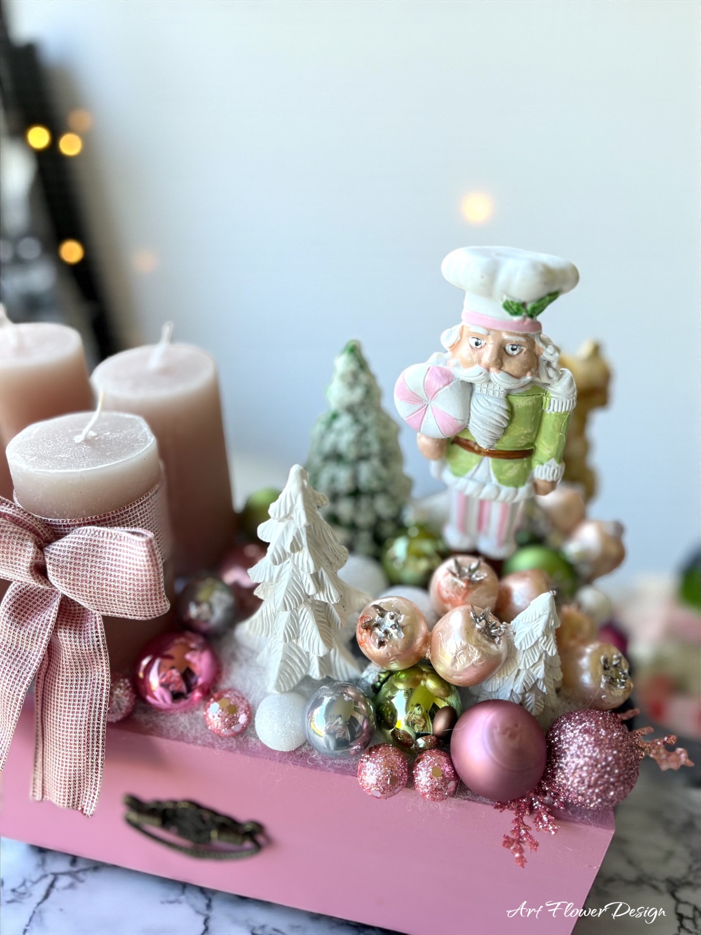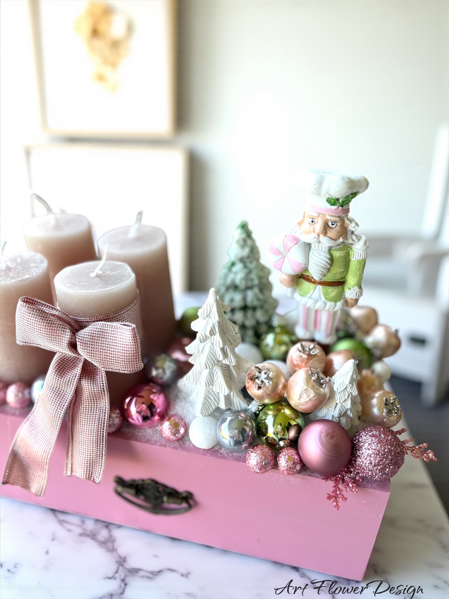 A fa dobozban négy gyertya, elegáns masni, csillogó gömbdíszek és egy bájos diótörő figura kapott helyet, kiegészítve téli fenyőkkel és apró részletekkel, melyek cukormázas, mesés hangulatot teremtenek.