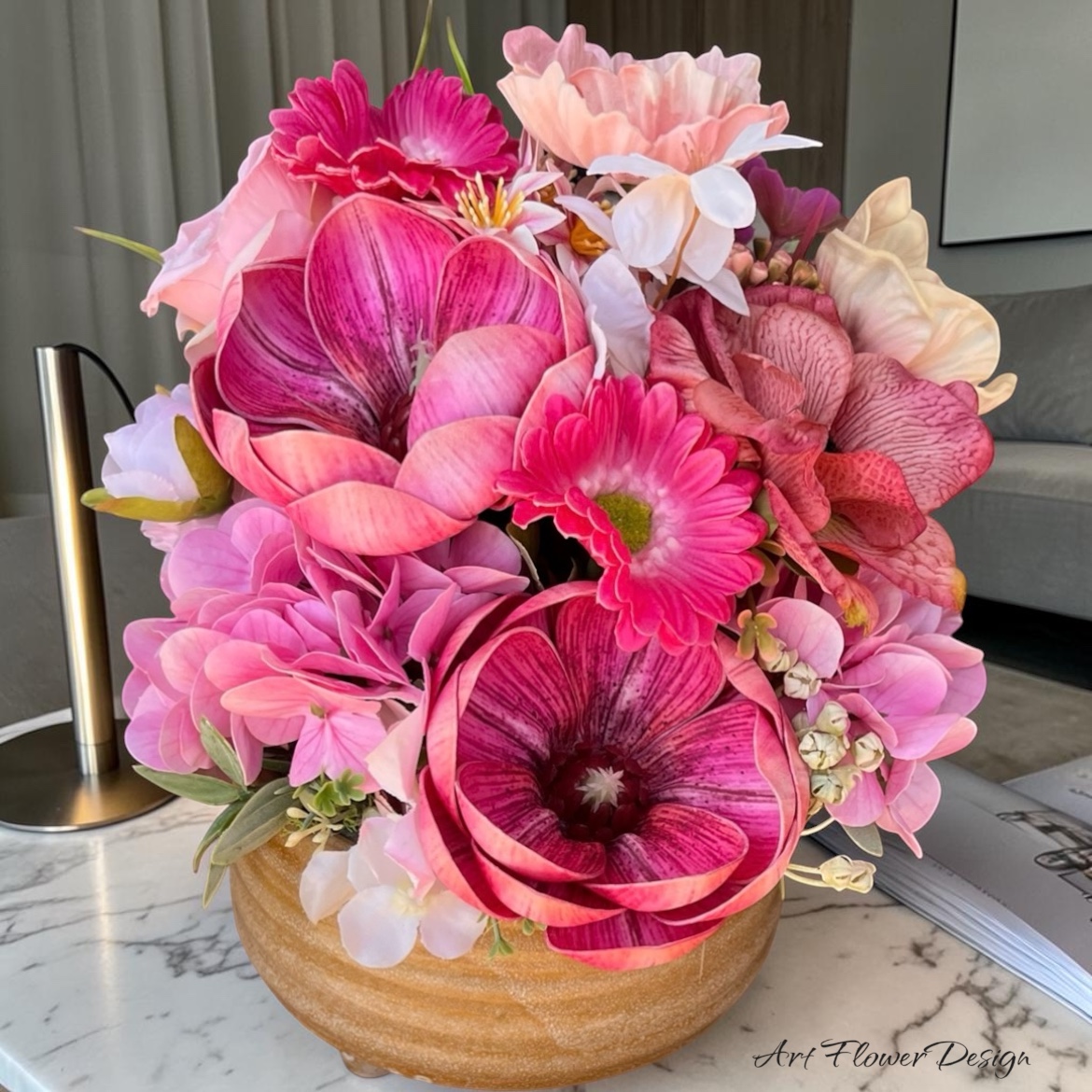 Ez a látványos asztaldísz a rózsaszín legintenzívebb, legélettelibb árnyalatait ünnepli. Az élénk, vibráló virágok azonnal magukra vonzzák a tekintetet, és határozott, mégis nőies karaktert adnak a térnek.