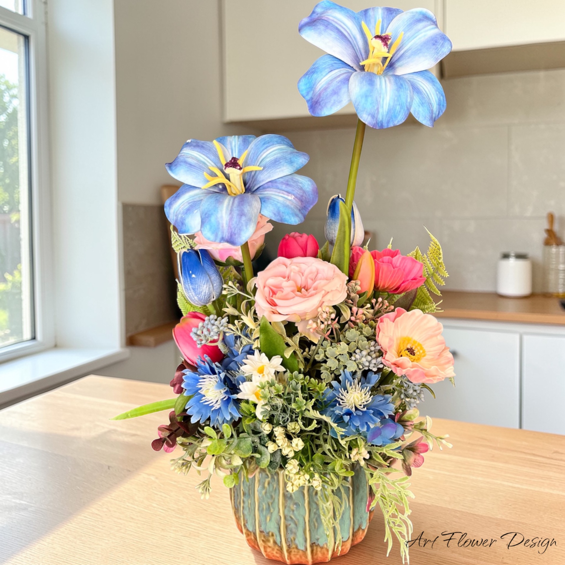 Időtálló selyemvirágokból készült, különleges kerámia kaspóban.