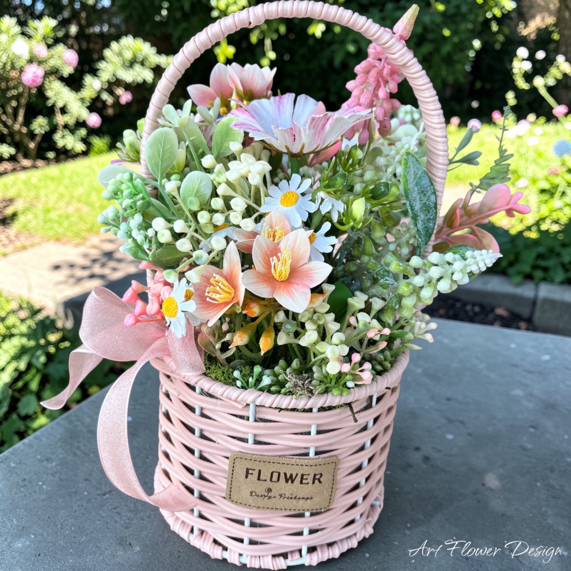 Romantikus hangulatú tavaszi dekoráció pasztell rózsaszín kosárban, selyemvirágokkal és egy kedves kis nyuszival. A kompozíció finom színeivel és természetes hatású virágaival szép kiegészítője lehet a húsvéti asztalnak, komódnak vagy polcnak.