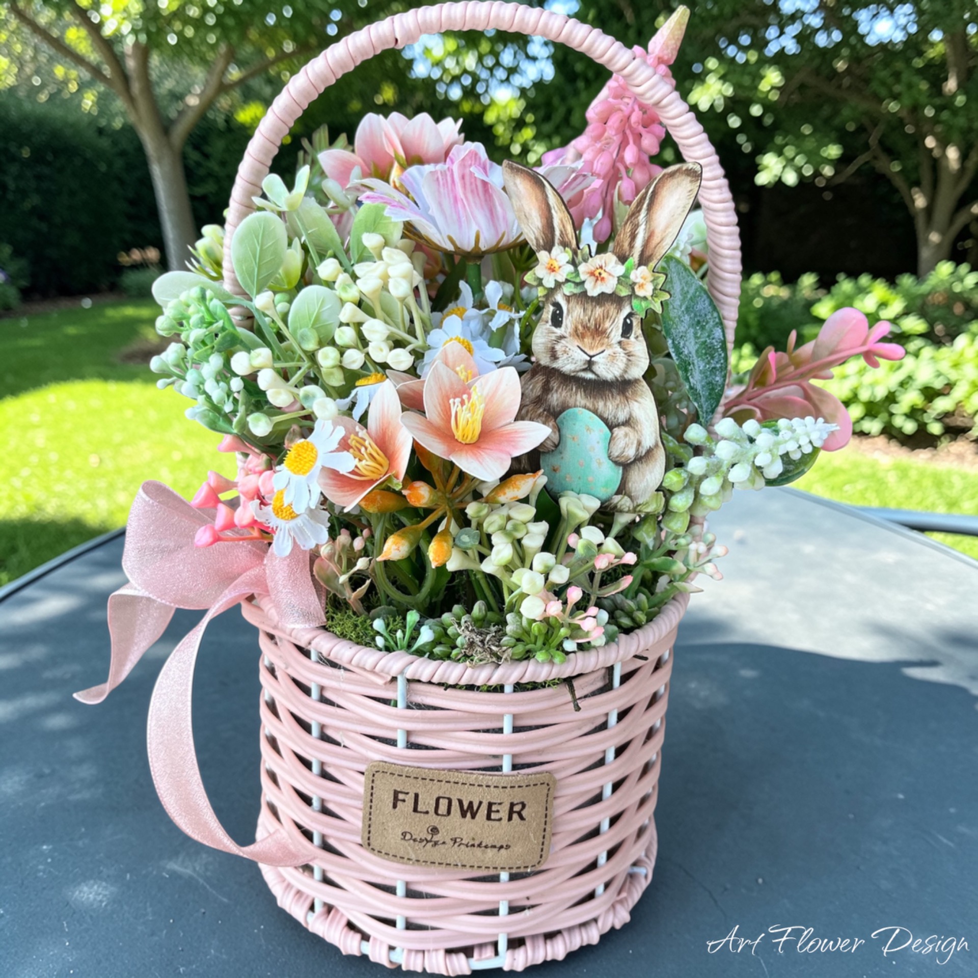 A nyuszi kivehető, így a kosár húsvét után is használható tavaszi virágos dekorációként.